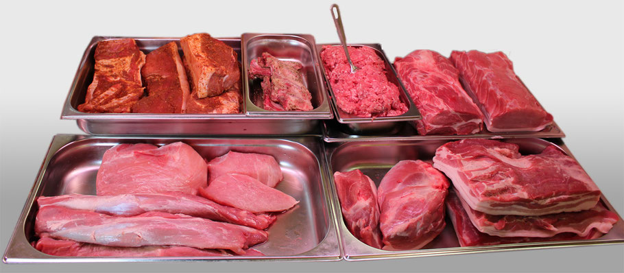 Natürlich erhalten Sie bei uns frisches Schweinefleisch, wie zB Schnitzel, Lungenbraten, Bauch, Schopf, Schulter, ...